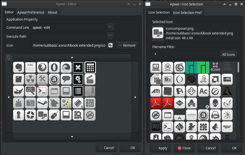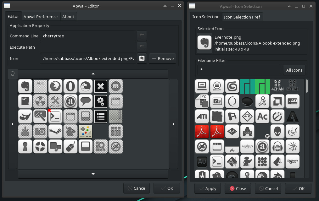 Ok, now its a fairly simple case of adding more applications to Apwal depending on what you want, and an icon to show for it, use the filter box on the icon display, if searching for an icon to mplayer for instance, filter *play* as an example to show any icons with play in their filename.